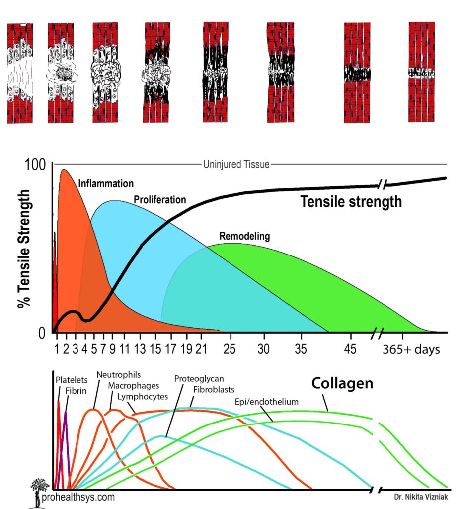 The goal after any soft tissue injury is to be up and have pain free movement as soon as possible, to find the balance between movement, exercise, traction, and rest (METH). This will improve healing outcomes substantially. The key words here are pain free. Movement too early after injury can initiate bleeding and cause further injury, however prolonged rest can lead to atrophy, contracture, and decrease in neural function of the damaged tissue. Early rehabilitation/mobilization has been shown to be effective in both minor injuries such as an ankle sprain (Jones and Amendola 2007, Kerkoffa et al. 2002, Bleakley et al. 2010) and more invasive procedures such as hip/knee joint replacements (Wellman et al. 2011, Ibrahim et al. 2013). The reason behind this standard medical practice is because progressive mechanical loading restores the strength and structural characteristics of collagen tissues better than prolonged rest (Bring et al. 2009; Martinez et al. 2007). Progressive mechanical loading activates cellular responses, which cause tissue structural changes (Khan and Scott 2009), such as upregulation of key proteins associated with soft tissue healing (Bring et al. 2009, Martinez et al. 2007, Eliasson et al. 2009).