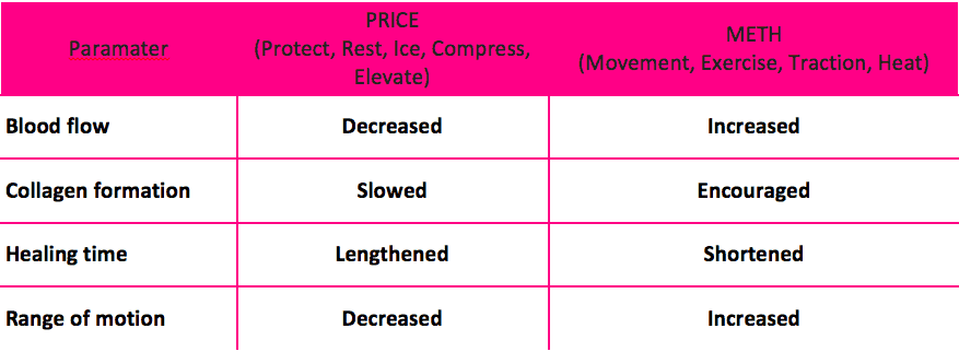 PRICE is best over short term (about 6 – 72 hours maximum) if there is any concern for developing compartment syndrome. From the table above, you can see that PRICE decrease both blood flow and collagen formation (great to fend off compartment syndrome), however it also increases healing time and decreases range of motion (bad for healing outcomes). Fibroblasts, myoblasts, and neurons require movement to build collagen and muscle fibers along lines of stress.